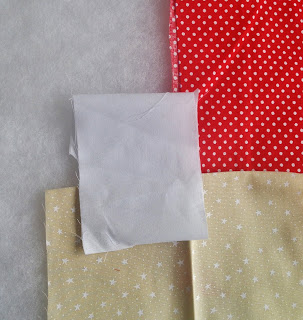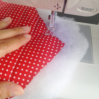 Pega-se o tecido vermelho de bolinha, coloca-se a manta acrílica por baixo e passa-se a costura várias vezes na diagonal seguindo as bolinhas com distanciamento mais ou menos de dois dedos cada costura. Isso ajuda a fixar a manta no tecido.