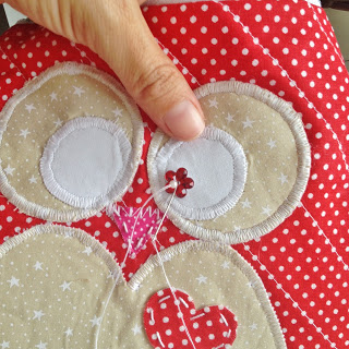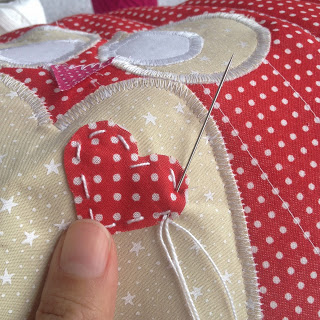 Recorde um coraçãozinho com o tecido vermelho de bolinha cole a entretela e depois com a linha Cléa branca 125 costure ele à mão com pontos grandes;