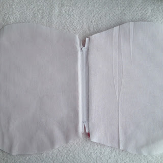 Agora pregue o tecido branco que é o forro junto ao zíper na parte de cima;