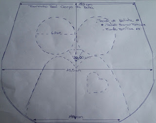 Para fazer a corujinha foram recortados quadrados de 25×25 do tecido de bolinha, do tecido branco e da manta acrílica, duas vezes cada um. Conforme o molde acima!