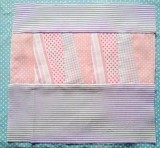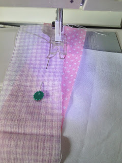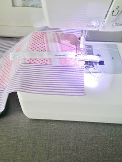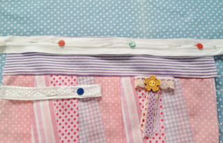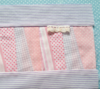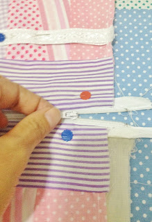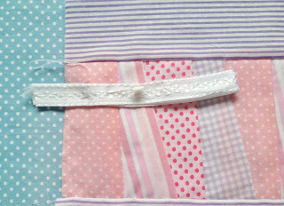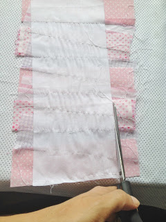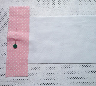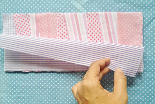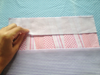 Agora costure o tecido menor de 28×6 cm na parte superior do tecido branco com os retângulos;