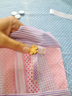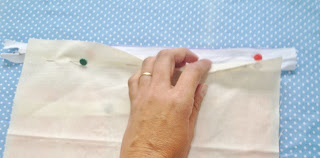 Corte uma tira de fita branca com uns 20cm, dobre ao meio e alfinete na lateral da bolsinha virada para dentro e passe a costura;