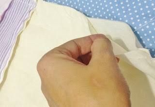 Feche o tecido, forro com forro e frente com frente ficará cada banda para um lado;