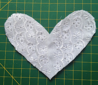 O primeiro coração menor recorte na cor branca e vá costurando a renda ou bordado em toda a sua extensão;