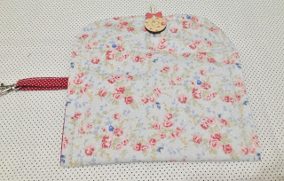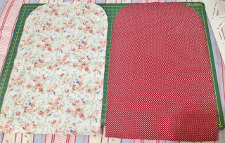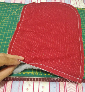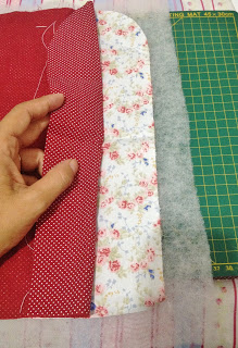 Para o corpo da carteira recorte um pedaço de tecido de 35×20 cm, duas vezes eu utilizei o etampado floral para a parte externa e o vermelho de bolinha para a parte interna, recorte a mesma medida de manta acrílica;