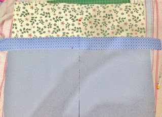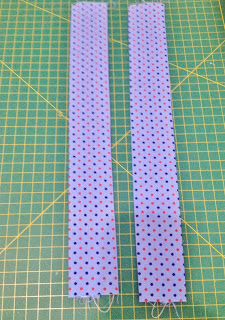 Recorte os tecidos que servirão como faixa para a bolsa eu recortei para a frente duas faixas de 23x10cm e uma para as costas de 46x10cm;