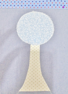 Recorte um círculo para a copa da árvore e depois o tronco aproveitando retalhos de tecidos que vc tiver, após recortar fixe no termocolante e cole com o ferro no tecido azul;