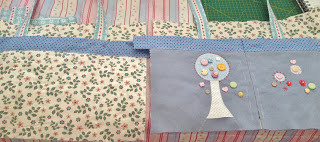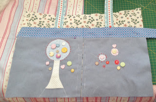 Depois costure mais botões espalhando em volta da árvore e na outra metade do tecido. Aproveite para alfinetar a alça, já é o momento de medir a altura que você quer que fique;