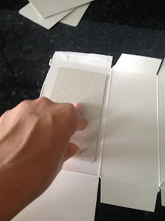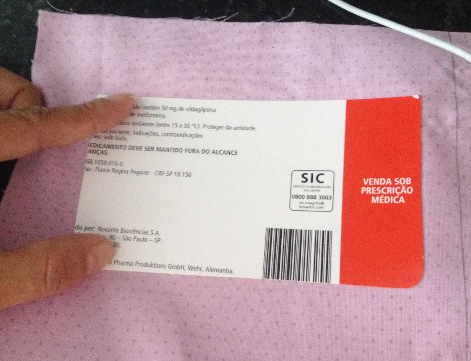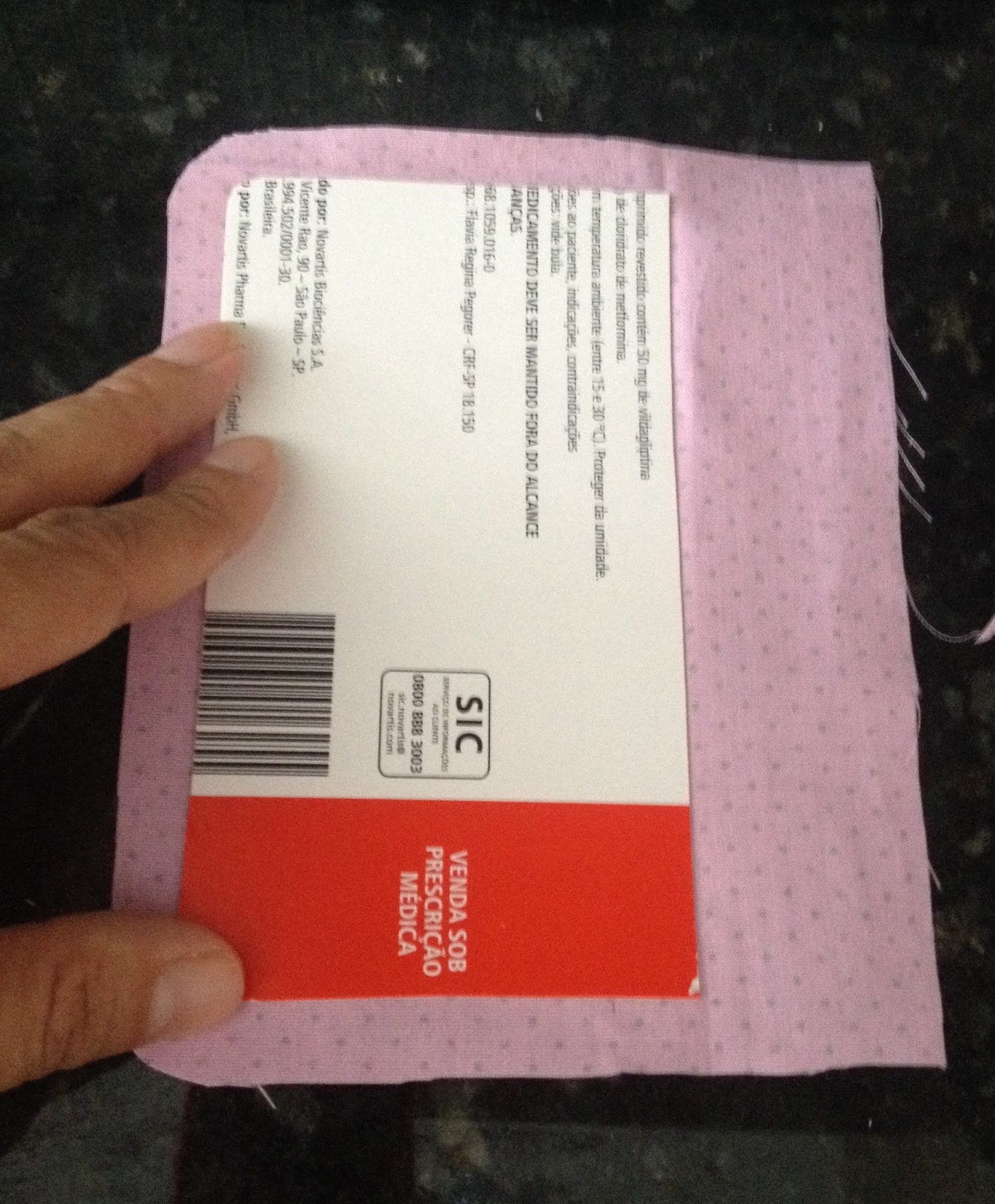 Pegue o papel que foi recortado da caixa passe cola e coloque em cima do tecido