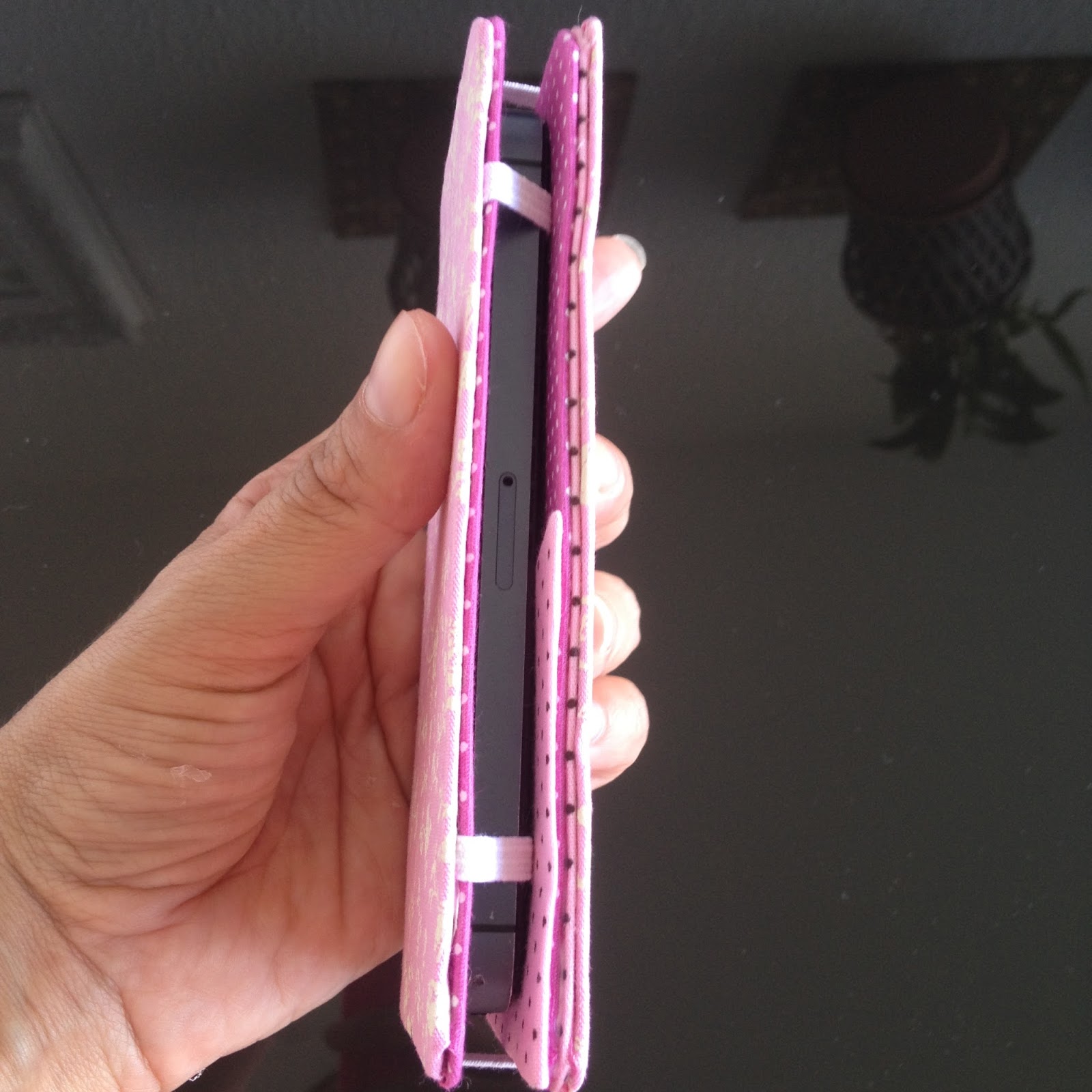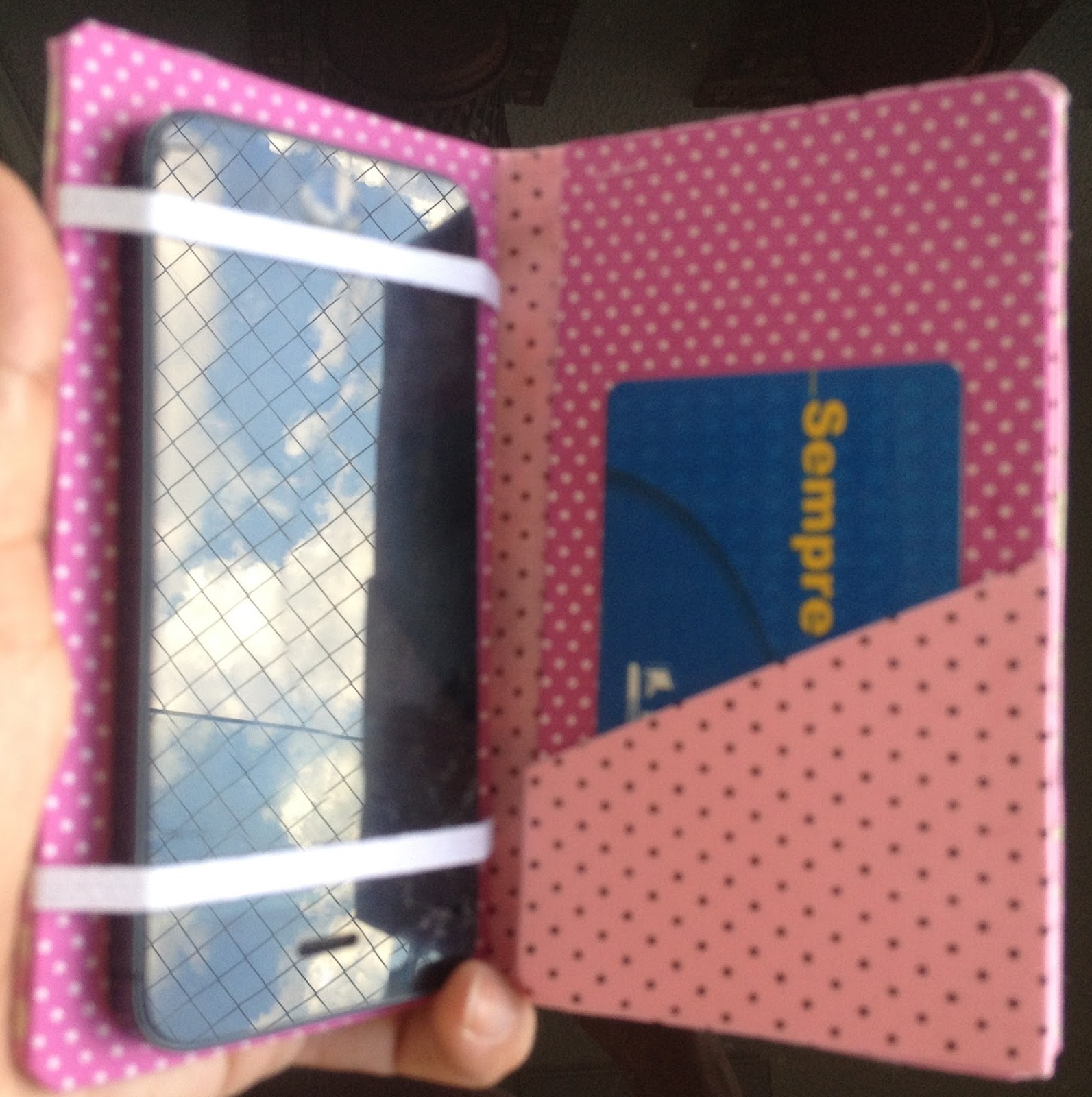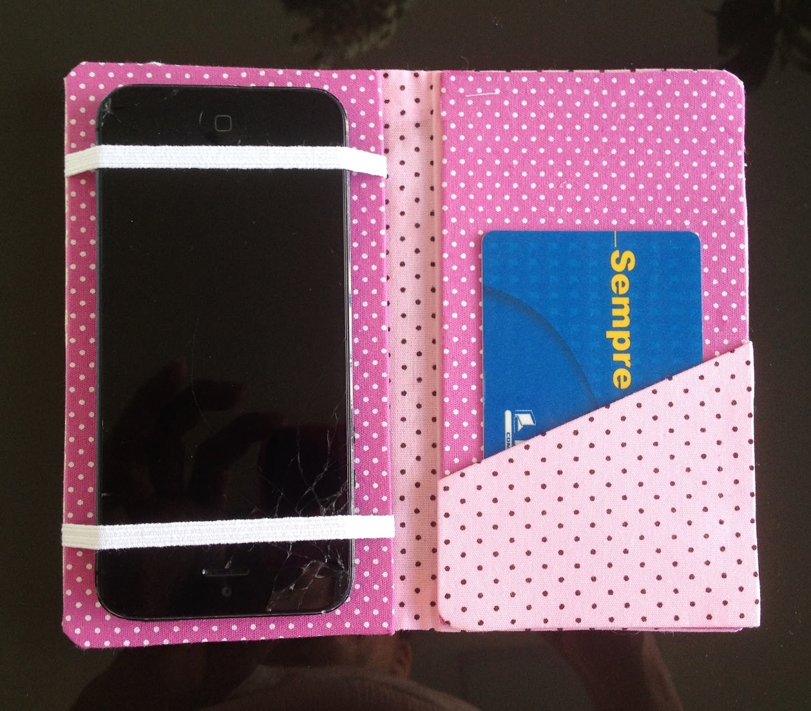 Use o seu celular para riscar no papel paraná ou papelão grosso, deixando mais meio centímetro na hora de cortar, meu celular é um Iphone 4S então as medidas foram 13x7cm;