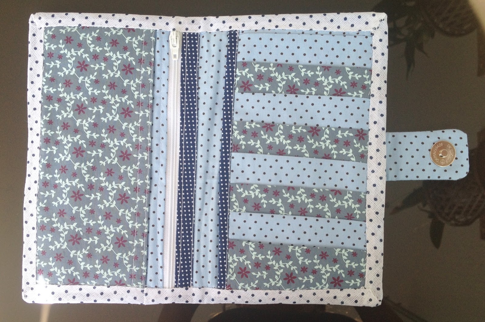 Essa é uma carteira feita em tecido de algodão em patchwork com estampa floral e de bolinhas na cor azul com compartimento para dinheiro e cartões. Segue o passo à passo para você acompanhar e fazer também. Boa costura!!!