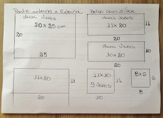 Obs: a medida de baixo que está 11×20 é com o tecido dobrado então o correto é 22x20cm, também aumentei a medida do de 8x6cm para 8x10cm;