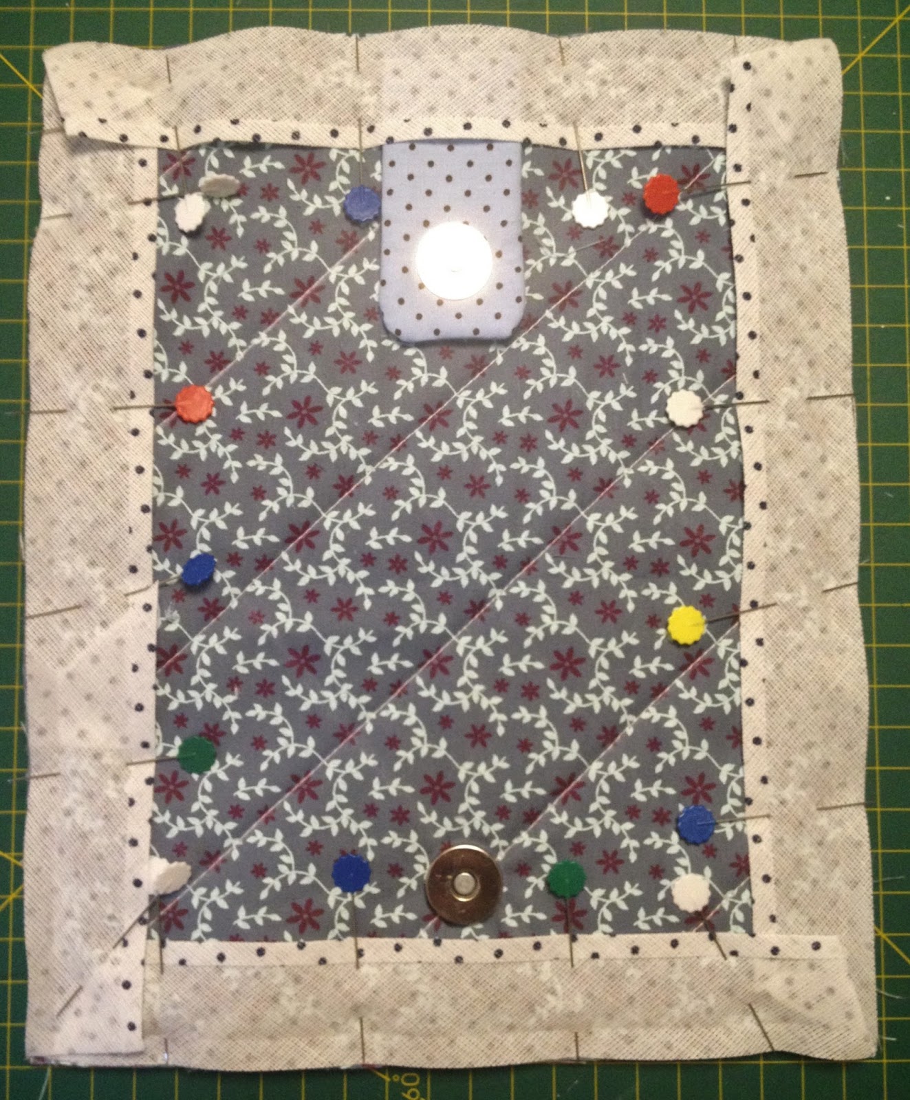 Coloque a parte do forro com os bolsos por cima da base do tecido que foi quiltado, alfinete e recorte qualquer rebarba, depois passe uma costura rente as laterais;