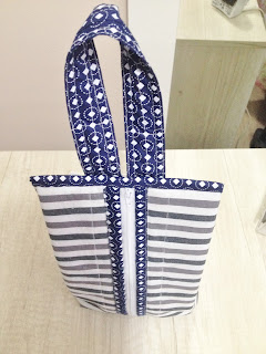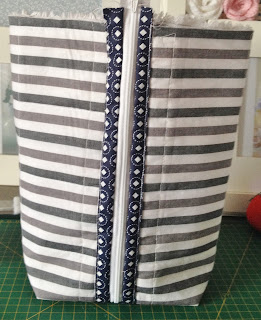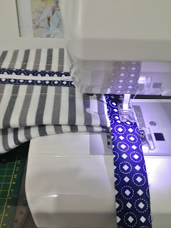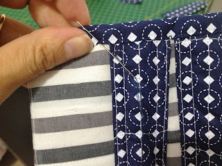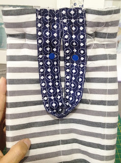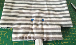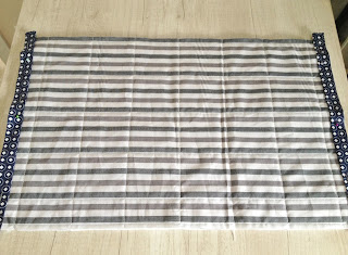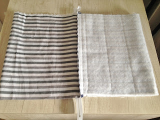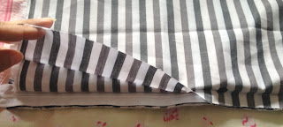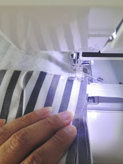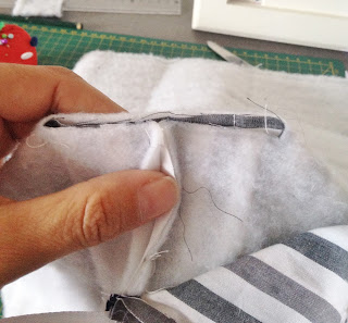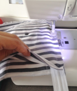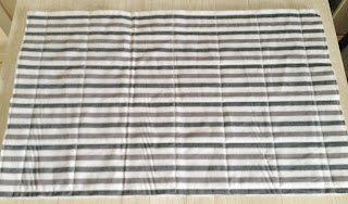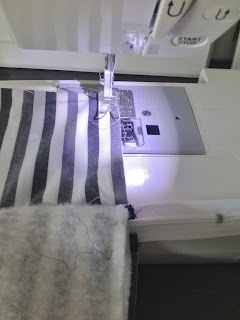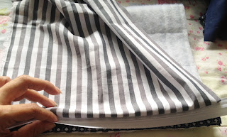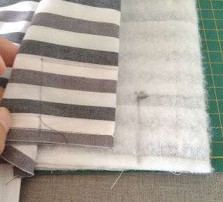 Depois de recortar o tecido maior que servirá para a base, coloque a manta por baixo e faça um trabalho de quilte ( costura que segura o tecido na manta), eu fiz quadrados no tecido listrado;