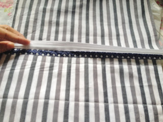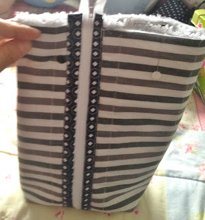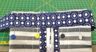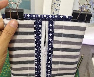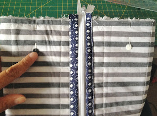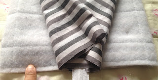 Agora pegue a outra ponta do tecido quiltado, alfinete na outra parte do zíper e faça o mesmo que foi feito com o forro;