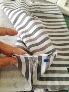 Alfinete na parte de cima o tecido dobrado e passe uma costura na extremidade;