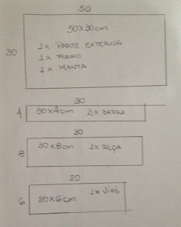 - Um tecido de 30×8 cm para fazer a alça mais a mesma medida para manta da alça;