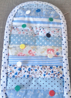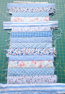 Recorte tiras de tecidos de retalhos estampados, eu preferí trabalhar com os tons de azul.
