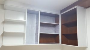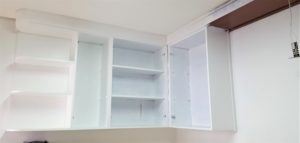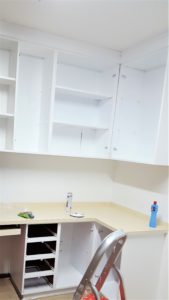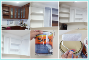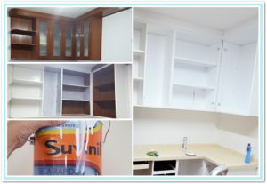 Para uma reforma existe um planejamento, eu optei pela recuperação do que eu tenho no ambiente, então eu resolví pintar meus armários de mogno com tinta esmalte na cor branca para clarear um pouco mais o ambiente escuro.