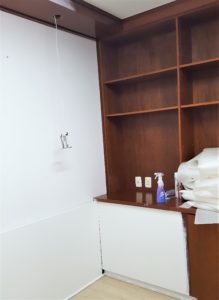 O ambiente original com os armários na cor mogno.
